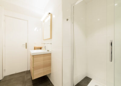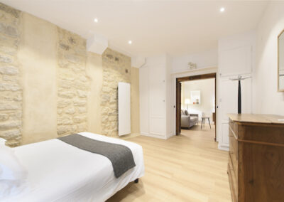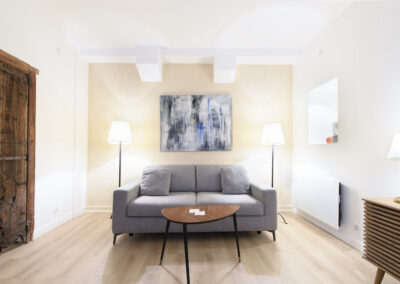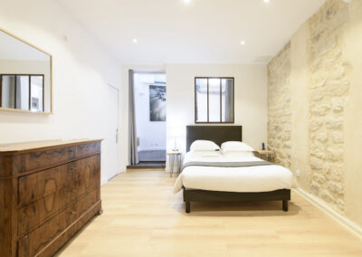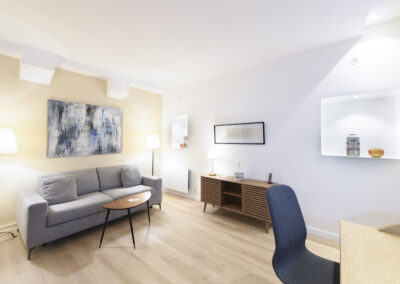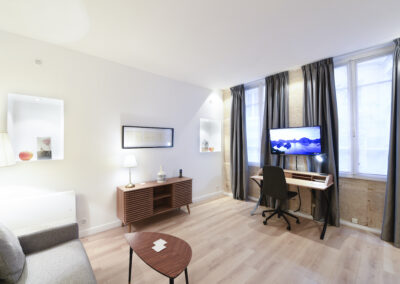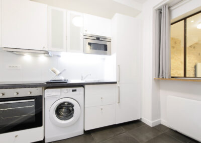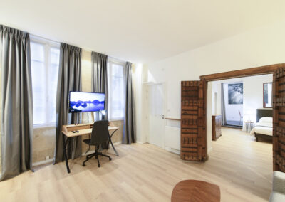 Cet appartement est composé d’un salon et d’une chambre indépendante. Le salon comprend un canapé-lit 2 places, et la chambre un lit double, installés avec leur linge de maison de qualité hôtelière. On dispose d’un petit espace de travail incluant une connexion Internet illimitée et gratuite. La cuisine entièrement équipée permet de préparer ses repas comme chez soi. L’appartement offre toutes les commodités, une penderie ainsi que de nombreux espaces de rangement.