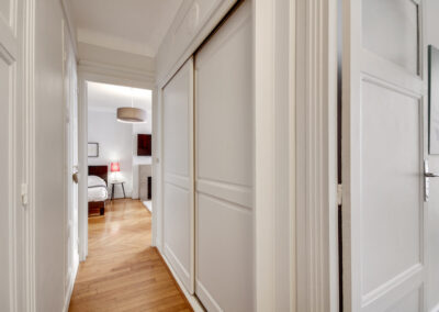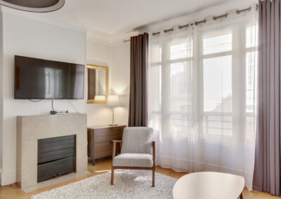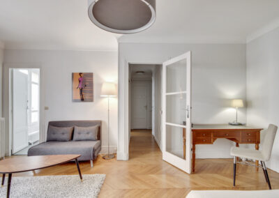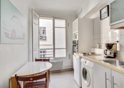 Cet appartement est composé d’un salon et d’une chambre indépendante. Le salon comprend un canapé-lit 2 places, et la chambre un lit double, installés avec leur linge de maison de qualité hôtelière. On dispose d’un petit espace de travail incluant une connexion Internet illimitée et gratuite. La cuisine entièrement équipée permet de préparer ses repas comme chez soi. L’appartement offre toutes les commodités, une penderie ainsi que de nombreux espaces de rangement.
