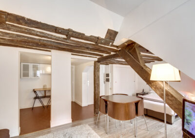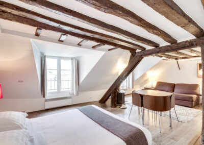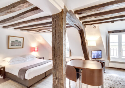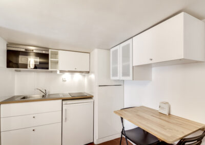 Ce grand studio est composé d’une pièce principale, avec un lit double et un canapé-lit 2 places, installés avec leur linge de maison de qualité hôtelière. On dispose d’un petit espace de travail incluant une connexion Internet illimitée et gratuite. La cuisine entièrement équipée permet de préparer ses repas comme chez soi. L’appartement offre toutes les commodités, une penderie ainsi que de nombreux espaces de rangement.
