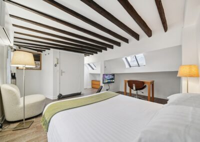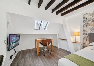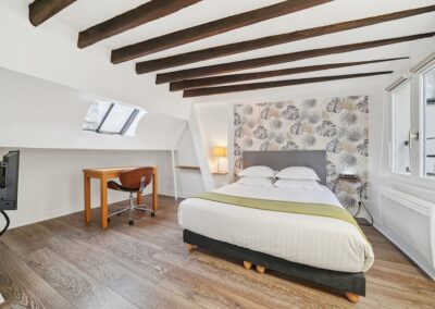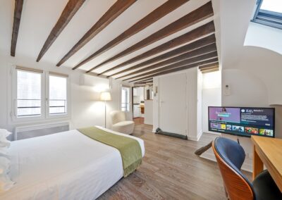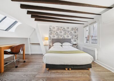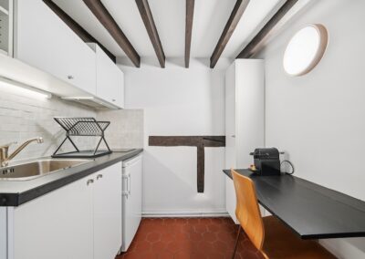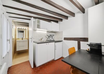 Ce studio est composé d’une pièce principale avec un lit double, installé avec son linge de maison de qualité hôtelière. On dispose d’un petit espace de travail incluant une connexion Internet illimitée et gratuite. La cuisine entièrement équipée permet de préparer ses repas comme chez soi. L’appartement offre toutes les commodités, une penderie ainsi que de nombreux espaces de rangement.