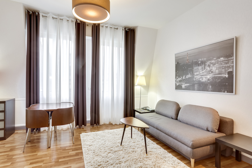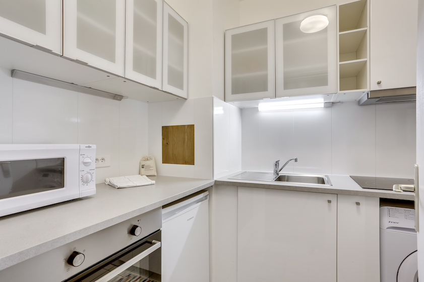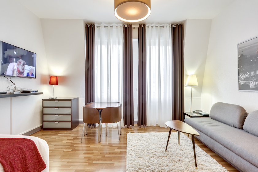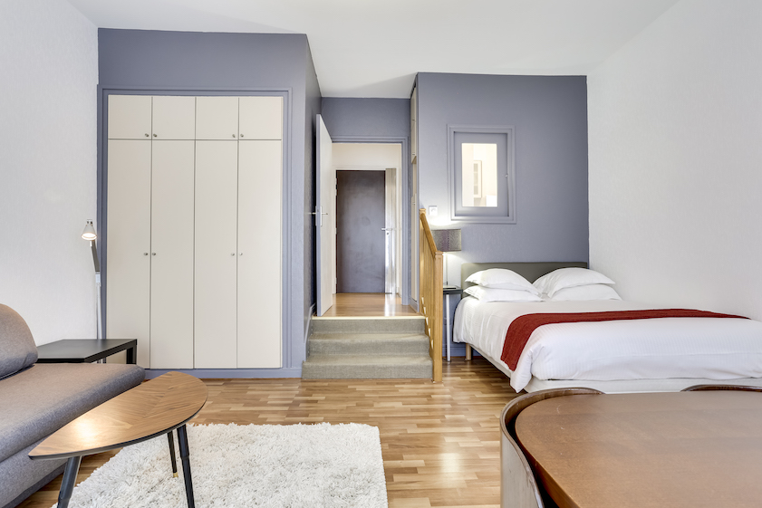 Ce grand studio est composé d’une pièce principale, avec un lit double et un canapé-lit 2 places, installés avec leur linge de maison de qualité hôtelière. On dispose d’un petit espace de travail incluant une connexion Internet illimitée et gratuite. La cuisine entièrement équipée permet de préparer ses repas comme chez soi. L’appartement offre toutes les commodités, une penderie ainsi que de nombreux espaces de rangement.